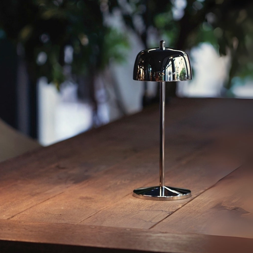 Theta Pro is a battery-operated and rechargeable portable table lamp with an iconic profile reminiscent of a hotel call bell. Its bell-shaped head sits on a slim stem and is topped with a turnable knob that adjusts brightness and color temperature